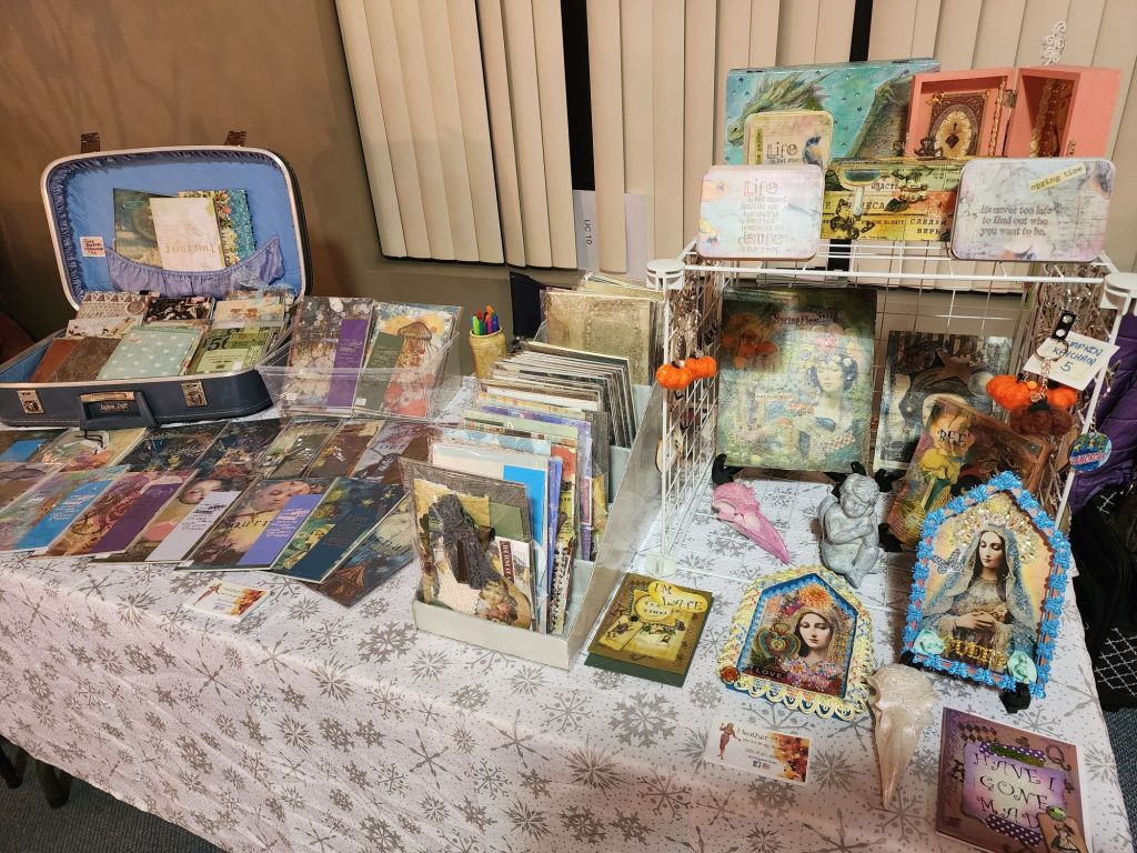 My table full of Journals, artwork, cards and boxes.